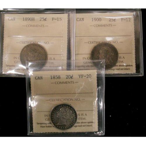 1858 20¢ ICCS VF20, Lot also includes 1890H F-15,1900F-12, both ICCS graded. 3 coins in all.