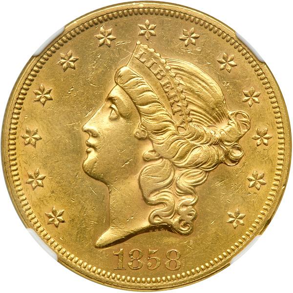 1858. NGC AU Details, improperly cleaned. Our grade AU-58, a very nice looking coin of the early P-mint No Motto style used from 1850 to 1866.