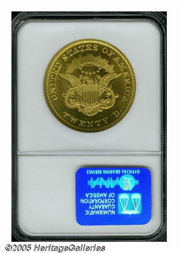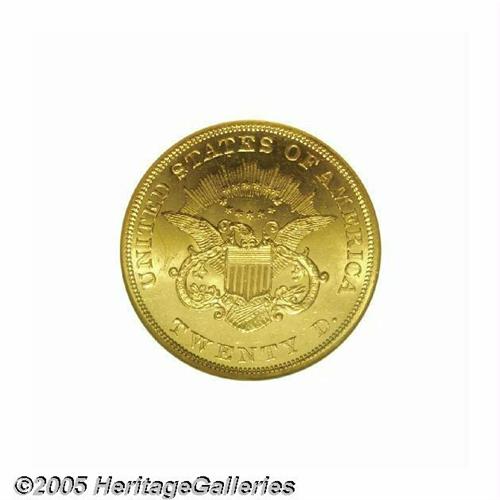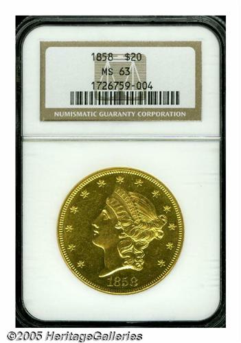 <B>1858<$20> MS63 NGC.</B></I> With the single exception of the 1859, the 1858 boasts the lowest mintage (211,714 pieces) of any P-mint Double Eagle from the 1850s. Equally as rare as the 1855, 1856, 1857, 1863, and 1864, the 1858 is typically encountered in grades that range from XF40 through AU58. There are only 39 Mint State survivors at NGC and PCGS, a few of which may represent resubmissions. We have not recently handled an example as fine as the present Select BU survivor, and it is tied for finest certified honors with four similarly graded PCGS coins.<BR> This is a satiny piece with striations in the fields that explain the modest semi-prooflike finish. The strike is needle sharp in all areas, and there are remarkably few obverse abrasions for the assigned grade. In fact, the only mentionable distractions are a group of scratches in the reverse field to the left of the eagle. A pleasingly colored, golden-rose representative of this conditionally challenging P-mint Twenty. Population: 1 in 63, 0 finer (6/05).<BR><I>From The Edward O'Neill Collection of Liberty Double Eagles.</B></I>