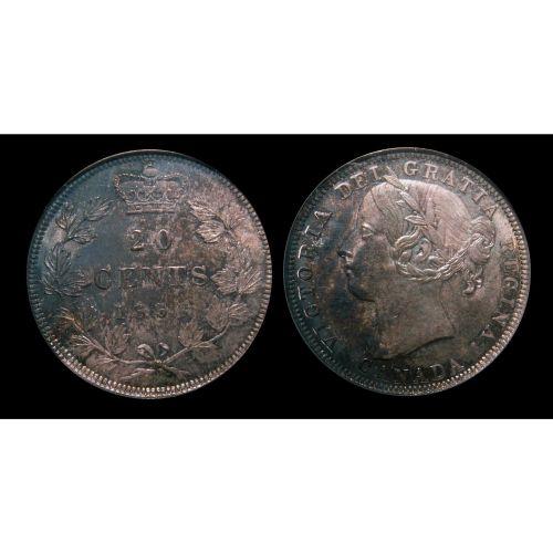 1858 20¢ PCGS MS-64. Light toning over full underlying luster. Excellent strike with clean fields and lovely surfaces.