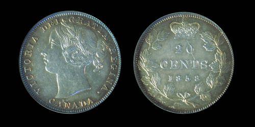 1858 20¢ PCGS MS63. Strong strike with great toning around the rims. Brilliant and lustrous at centers.