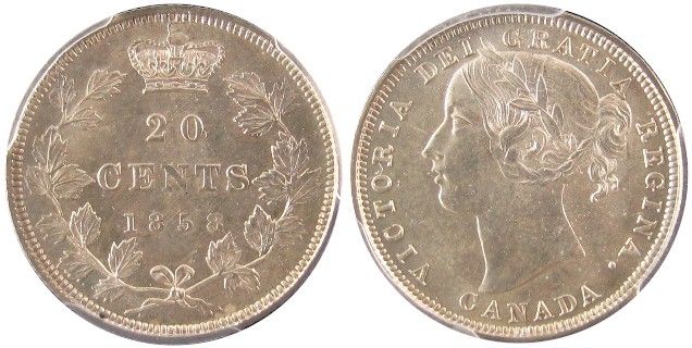 1858 20¢ PCGS MS64. Crisp frosty white example. Flashy'