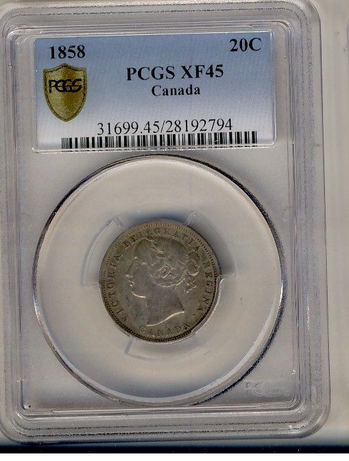 1858 20¢ PCGS XF45. lightly toned.