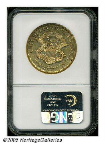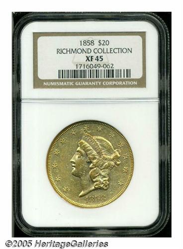 <B>1858<$20> XF45 NGC.</B></I> A bright yellow-gold example with a few tints of ruby-mauve color on the reverse. Several bagmarks are distributed on the obverse. A relatively low mintage issue, since west coast bullion was by now coined at the San Francisco Mint.