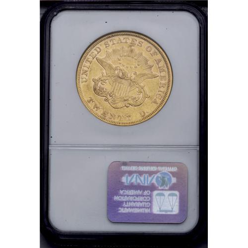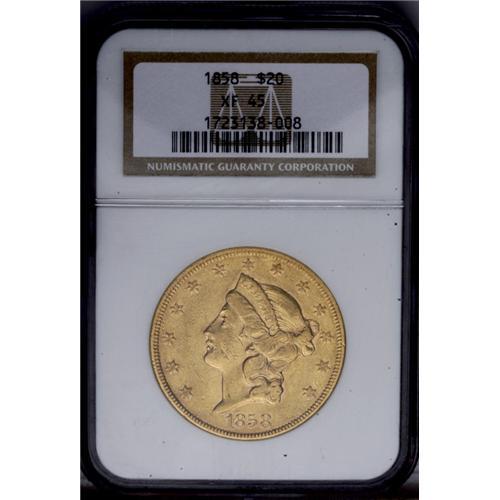 <B>1858<$20> XF45 NGC.</B></I> Still mildly lustrous, with bright pink and pale green-gold toning. Typically worn for the assigned grade and moderately abraded on the obverse. One of the lower mintage P-mints of this type, and a more difficult date in all grades.<BR><I>From The Steve Glenn Collection.</B></I> <BR><BR><B>Important notice:</B> Heritage usually auctions material at the rate of 200-250 lots per hour. On some occasions eBay Live bid software or the Internet may not be able to keep up with the pace of the auction. We recommend placing a realistic absentee bid now as insurance to avoid disappointment. Occasionally the auctioneer may eliminate or reject an eBay Live bid, and the auctioneer may also reopen a lot after the close of the eBay live bidding (usually because we missed an audience bid), and may reject your bid even if it shows you as the winning bidder. By bidding via eBay Live, you agree that Heritage may award the lot to another bidder at its sole discretion under the circumstances described above or any other reasonable circumstances. Since eBay bids are not shown to us until we open the lot on the floor, we treat those bids just like floor bids. In most cases the floor responds before the eBay bid is presented to us, due to Internet lag time, so for consistency we have made it a policy that floor bids are always considered first over tie eBay live bids. Also please note that all Heritage lots purchased through eBay Live carry a 20% Buyer's Premium. Please make sure you read the Terms and Conditions before you bid. This lot is being auctioned in conjunction with a live floor auction by Heritage Galleries & Auctioneers. All final auction and invoice information will be supplied by Heritage Galleries & Auctioneers, and all other information should be considered preliminary. Lot:4199 <BR><BR><B>Winning Notification and Billing:</B> After the FINAL session in this auction is complete, Heritage will send e-mail and snail mail invoices. This process normally takes several days. All final auction and invoice information will be supplied by Heritage Galleries & Auctioneers, and all other information should be considered preliminary. <BR><BR>This auction will be conducted on a live auction floor and over the Internet through eBay Live. If you choose to place an absentee bid, please take a moment to <font color='#0000ff'><u><a href='http://pages.ebay.com/liveauctions/help/before/laabsentee.html'>learn how eBay Live absentee bidding works</a></u></font><font color='#000000'>