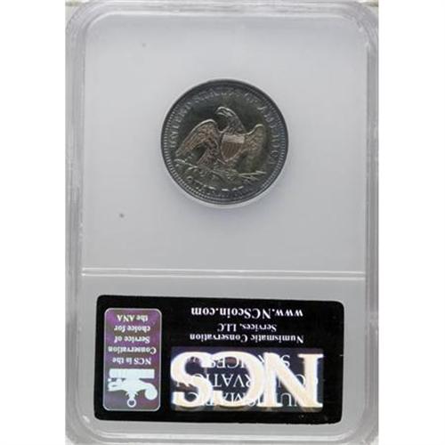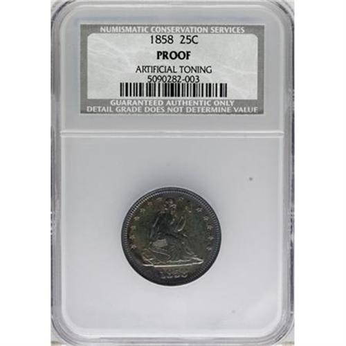 <B>1858 25C --Artificial Toning--NCS. Proof.</B></I> The 1858 quarter proof mintage is given as 80 pieces by Larry Briggs (1991), but as 300 coins by the 2008 <I>Guide Book</B></I>. Cobalt-blue and lavender coloration bathes glossy surfaces of this specimen. Exquisitely struck, with no significant marks.<BR><BR><b>Shipping:</b> Coins & Currency (<a target="_blank" href="http://www.heritageauctions.com/common/shipping.php">view shipping information</a>)