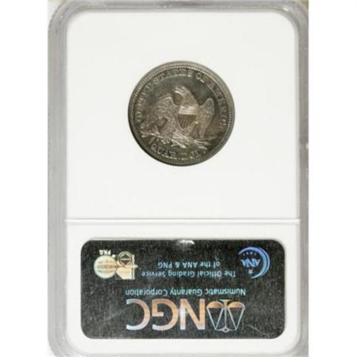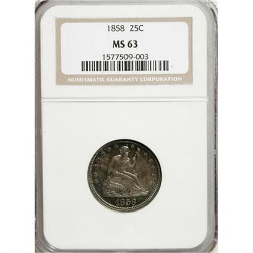 <B>1858 25C MS63 NGC.</B></I> A well struck Select Seated piece that displays vibrant luster beneath vivid peach and blue-green patina. A handful of wispy and inoffensive abrasions on each side account for the grade.<BR><BR><B>Coin Engraver:</B> Christian Gobrecht<BR><BR><b>Shipping:</b> Coins & Currency (<a target="_blank" href="http://www.heritageauctions.com/common/shipping.php">view shipping information</a>)