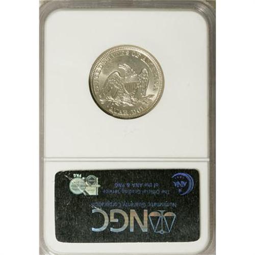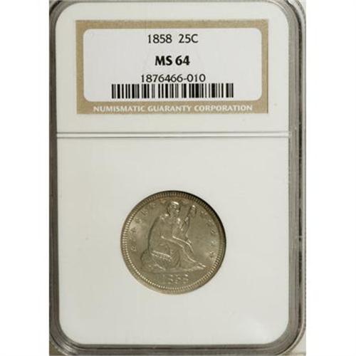 <B>1858 25C MS64 NGC.</B></I> A strongly lustrous representative of this post-weight-adjustment issue, well-defined in the centers with a touch of weakness at the right stars. Delicate tan-gold patina graces both sides.<BR><BR><b>Shipping:</b> Coins & Currency (<a target="_blank" href="http://www.heritageauctions.com/common/shipping.php">view shipping information</a>)