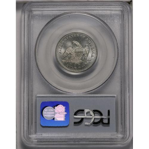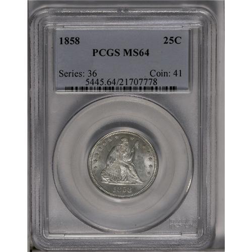 <B>1858<25C> MS64 PCGS.</B></I> Briggs 1-C. Die crack from rim through lower curl of "C" in AMERICA, to upper right wing. Severe die clash marks below both wings, above left wing, and within the shield. The high-mintage 1858 quarter is one of the few issues of the No Motto type that can occasionally be found at the finer levels of Mint State. This bright, untoned example displays excellent sharpness, save for the final few obverse stars and some of Liberty's upper hair detail. Some wispy marks are observed in the right obverse field. Population: 67 in 64, 38 finer (6/06).