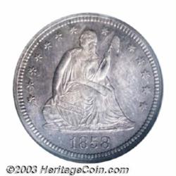 <TABLE cellSpacing=0 cellPadding=0 width="100%" bgColor=#000000 border=0><TBODY><TR><TD width="100%"><TABLE cellSpacing=1 cellPadding=3 width="100%" border=0><TBODY><TR><TD width="100%" bgColor=#79735c><FONT face=arial color=#ffffff size=3><B>Description</B> </FONT></TD></TR><TR><TD width="100%" bgColor=#ffffff><FONT face=arial size=2><B>1858 25C MS65 NGC.</B></I> A fully original, Gem example. Each side exhibits medium gray color that is accented with soft rose colorations. Some softness of strike is noticed on several of the obverse stars, and a small contact mark is noted below the eagle on the reverse. </FONT></TD></TR></TBODY></TABLE></TD></TR></TBODY></TABLE><BR><A name=PricesRealized></A><TABLE cellSpacing=0 cellPadding=0 width="100%" bgColor=#000000 border=0><TBODY><TR><TD width="100%"><TABLE cellSpacing=1 cellPadding=3 width="100%" border=0><TBODY><TR><TD width="100%" bgColor=#79735c><A name=PR><FONT face=arial color=#ffffff size=3><B>Previous Prices from Heritage Auctions</B> </FONT></A></TD></TR><TR><TD bgColor=#f6f6ed><TABLE cellSpacing=0 cellPadding=0 width="100%" border=1><TBODY><TR><TD align=middle width="33%"><B>Date</B></TD><TD align=middle width="33%"><B>Service</B></TD><TD align=middle width="33%"><B>Price</B></TD></TR><TR bgColor=whitesmoke><TD width="33%"><B>08/09/2000</B></TD><TD width="33%">PCGS</TD><TD width="33%">$2,760.00</TD></TR><TR bgColor=whitesmoke><TD width="33%"><B>05/31/2001</B></TD><TD width="33%">PCGS</TD><TD width="33%">$2,645.00</TD></TR><TR bgColor=whitesmoke><TD width="33%"><B>07/01/1996</B></TD><TD width="33%">PCGS</TD><TD width="33%">$2,970.00</TD></TR><TR bgColor=whitesmoke><TD width="33%"><B>02/01/1999</B></TD><TD width="33%">PCGS</TD><TD width="33%">$3,135.00</TD></TR><TR bgColor=whitesmoke><TD width="33%"><B>02/11/2000</B></TD><TD width="33%">NGC</TD><TD width="33%">$1,840.00</TD></TR><TR bgColor=whitesmoke><TD width="33%"><B>03/01/1998</B></TD><TD width="33%">NGC</TD><TD width="33%">$2,200.00</TD></TR><TR bgColor=whitesmoke><TD width="33%"><B>03/23/2003</B></TD><TD width="33%">NGC</TD><TD width="33%">$2,357.50</TD></TR><TR bgColor=whitesmoke><TD width="33%"><B>05/03/2003</B></TD><TD width="33%">NGC</TD><TD width="33%">$2,300.00</TD></TR></TBODY></TABLE></TD></TR><TR><TD bgColor=#ffffff><FONT face=arial size=1 ?>PLEASE NOTE: All prices realized reflect the final hammer price PLUS the buyer's premium in auctions that charge a buyer's premium. Each item has a notation at the top of the listing indicating whether that lot included a buyer's premium. Example: A item that sells with a final hammer price of $100 and a 20% buyer's premium will display with a price realized of $120. All information listed is intended to be as accurate as possible, but errors are possible. Please use this guide carefully and inform us of any inaccuracies. </FONT></TD></TR></TBODY></TABLE></TD></TR></TBODY></TABLE><BR><TABLE cellSpacing=0 cellPadding=0 width="100%" bgColor=#000000 border=0><TBODY><TR><TD width="100%"><TABLE cellSpacing=1 cellPadding=3 width="100%" border=0><TBODY><TR><TD width="100%" bgColor=#79735c colSpan=6><FONT face=arial color=#ffffff size=3><B>Price Guide*</B> </FONT></TD></TR><TR bgColor=#f6f6ed><TD align=middle><B>Grade</B> </TD><TD align=middle><B>Coin World<BR>(Trends)</B> </TD><TD align=middle><B>Numismedia<BR>Retail</B> </TD><TD align=middle><B>Numismedia<BR>Wholesale</B> </TD><TD align=middle><B>Coin<BR>Universe</B> </TD><TD align=middle><B>Heritage<BR>Value Index</B> </TD></TR><TR bgColor=#ffffff><TD align=middle>64</TD><TD align=right>$1,175.00</TD><TD align=right>---</TD><TD align=right>$800.00</TD><TD align=right>$1,250.00</TD><TD align=right>$809.38</TD></TR><TR style="FONT-WEIGHT: bold" bgColor=#cccfdd><TD align=middle>65</TD><TD align=right>---</TD><TD align=right>---</TD><TD align=right>$2,975.00</TD><TD align=right>$4,500.00</TD><TD align=right>$2,720.83</TD></TR><TR bgColor=#ffffff><TD align=middle>66</TD><TD align=right>---</TD><TD align=right>---</TD><TD align=right>$4,725.00</TD><TD align=right>$6,750.00</TD><TD align=right>$4,462.50</TD></TR><TR bgColor=#ffffff><TD colSpan=6><FONT size=1>*All information listed is intended to be as accurate as possible, but errors are possible. No item may be returned or refused based on this information which is provided as a service to our customers. You should contact each pricing source directly to determine the accuracy of this information. </FONT></TD></TR></TBODY></TABLE></TD></TR></TBODY></TABLE><BR><TABLE cellSpacing=0 cellPadding=0 width="100%" bgColor=#000000 border=0><TBODY><TR><TD width="100%"><TABLE cellSpacing=1 cellPadding=3 width="100%" border=0><TBODY><TR><TD width="100%" bgColor=#79735c><FONT face=arial color=#ffffff size=3><B>Population Guide</B> </FONT></TD></TR><TR bgColor=#ffffff><TD align=middle><!-- Begin Output of Population Grid--><TABLE cellSpacing=0 cellPadding=0 width="100%" border=0><TBODY><TR><TD vAlign=center><TABLE cellSpacing=0 width="100%" border=1 cellsadding="3"><TBODY><TR><TD vAlign=center><TABLE cellSpacing=0 cellPadding=3 width="100%" border=1><TBODY><TR><TD vAlign=center align=middle bgColor=#f0f1e8 colSpan=2 <CENTER><FONT face=Arial size=2><B>PCGS Pop </B></FONT><CENTER></CENTER></TD><TD vAlign=center align=middle bgColor=#f0f1e8 colSpan=2><CENTER><FONT face=Arial size=2><B>NGC Pop</B></CENTER></FONT></TD></TR><TR><TD vAlign=center><FONT face=Arial size=2>(65)</FONT> </TD><TD vAlign=center align=right><FONT face=Arial size=2>26</FONT> </TD><TD vAlign=center><FONT face=Arial size=2>(65)</FONT> </TD><TD vAlign=center align=right><FONT face=Arial size=2>21</FONT> </TD></TR><TR><TD vAlign=center><FONT face=Arial size=2>(>65)</FONT> </TD><TD vAlign=center align=right><FONT face=Arial size=2>8</FONT> </TD><TD vAlign=center><FONT face=Arial size=2>(>65)</FONT> </TD><TD vAlign=center align=right><FONT face=Arial size=2>13</FONT> </TD></TR></TBODY></TABLE></TD></TR></TBODY></TABLE></TD></TR></TBODY></TABLE><!-- End Output of Population Grid--> Important notic
