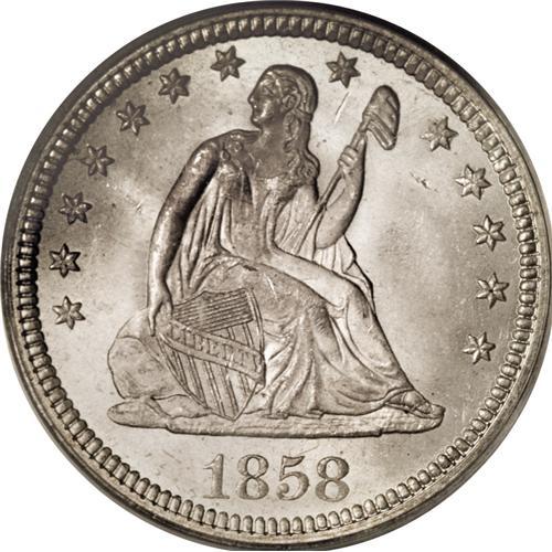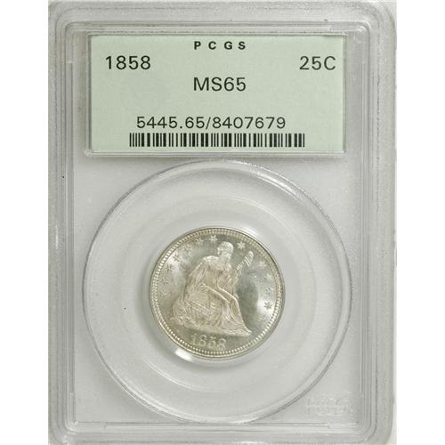 <B>1858 25C MS65 PCGS.</B></I> Faint gold toning visits this highly lustrous and lightly abraded Gem. Sharply struck save for minor softness on Liberty's legs and the eagle's left shield border. An attractive No Motto type coin. Certified in a green label holder. Population: 31 in 65, 10 finer (3/07).<BR><I>From The Palakika Collection.</B></I><BR><BR><b>Shipping:</b> Coins & Currency (<a target="_blank" href="http://www.heritageauctions.com/common/shipping.php">view shipping information</a>)