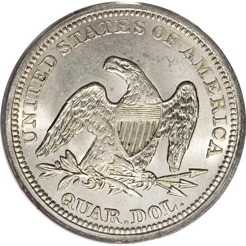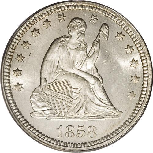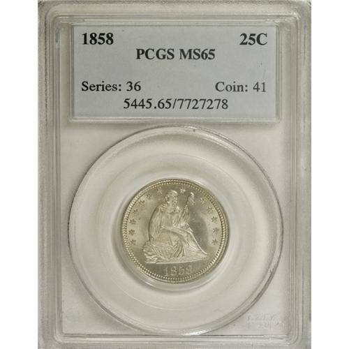 <B>1858 25C MS65 PCGS.</B></I> The high-mintage 1858 quarter is one of the few issues of the No Motto type that can occasionally be found at the Gem level of preservation. This bright, untoned example displays excellent sharpness save for the final few obverse stars and portions of the eagle's neck feathers. Population: 31 in 65, 10 finer (2/07).<BR><BR><b>Shipping:</b> Coins & Currency (<a target="_blank" href="http://www.heritageauctions.com/common/shipping.php">view shipping information</a>)