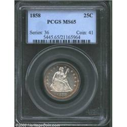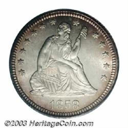 <TABLE cellSpacing=0 cellPadding=0 width="100%" bgColor=#000000 border=0><TBODY><TR><TD width="100%"><TABLE cellSpacing=1 cellPadding=3 width="100%" border=0><TBODY><TR><TD width="100%" bgColor=#79735c><FONT face=arial color=#ffffff size=3><B>Description</B> </FONT></TD></TR><TR><TD width="100%" bgColor=#ffffff><FONT face=arial size=2><B>1858 25C MS65 PCGS.</B></I> Warm rose-gold hues embrace the peripheries, while the centers are untoned. A sharply struck Gem with shimmering semi-prooflike fields and an exceptionally clean reverse. The right obverse field has a couple of very faint abrasions that are appropriate for the grade and do not detract from the original appearance of this impressive type coin.<BR><I>Ex: Fall 1988 Long Beach Sale (Heritage, 9/1988), lot 506, which realized $2,090.</B></I> </FONT></TD></TR></TBODY></TABLE></TD></TR></TBODY></TABLE><BR><A name=PricesRealized></A><TABLE cellSpacing=0 cellPadding=0 width="100%" bgColor=#000000 border=0><TBODY><TR><TD width="100%"><TABLE cellSpacing=1 cellPadding=3 width="100%" border=0><TBODY><TR><TD width="100%" bgColor=#79735c><A name=PR><FONT face=arial color=#ffffff size=3><B>Previous Prices from Heritage Auctions</B> </FONT></A></TD></TR><TR><TD bgColor=#f6f6ed><TABLE cellSpacing=0 cellPadding=0 width="100%" border=1><TBODY><TR><TD align=middle width="33%"><B>Date</B></TD><TD align=middle width="33%"><B>Service</B></TD><TD align=middle width="33%"><B>Price</B></TD></TR><TR bgColor=whitesmoke><TD width="33%"><B>08/09/2000</B></TD><TD width="33%">PCGS</TD><TD width="33%">$2,760.00</TD></TR><TR bgColor=whitesmoke><TD width="33%"><B>05/31/2001</B></TD><TD width="33%">PCGS</TD><TD width="33%">$2,645.00</TD></TR><TR bgColor=whitesmoke><TD width="33%"><B>07/01/1996</B></TD><TD width="33%">PCGS</TD><TD width="33%">$2,970.00</TD></TR><TR bgColor=whitesmoke><TD width="33%"><B>02/01/1999</B></TD><TD width="33%">PCGS</TD><TD width="33%">$3,135.00</TD></TR><TR bgColor=whitesmoke><TD width="33%"><B>02/11/2000</B></TD><TD width="33%">NGC</TD><TD width="33%">$1,840.00</TD></TR><TR bgColor=whitesmoke><TD width="33%"><B>03/01/1998</B></TD><TD width="33%">NGC</TD><TD width="33%">$2,200.00</TD></TR><TR bgColor=whitesmoke><TD width="33%"><B>03/23/2003</B></TD><TD width="33%">NGC</TD><TD width="33%">$2,357.50</TD></TR><TR bgColor=whitesmoke><TD width="33%"><B>05/03/2003</B></TD><TD width="33%">NGC</TD><TD width="33%">$2,300.00</TD></TR></TBODY></TABLE></TD></TR><TR><TD bgColor=#ffffff><FONT face=arial size=1 ?>PLEASE NOTE: All prices realized reflect the final hammer price PLUS the buyer's premium in auctions that charge a buyer's premium. Each item has a notation at the top of the listing indicating whether that lot included a buyer's premium. Example: A item that sells with a final hammer price of $100 and a 20% buyer's premium will display with a price realized of $120. All information listed is intended to be as accurate as possible, but errors are possible. Please use this guide carefully and inform us of any inaccuracies. </FONT></TD></TR></TBODY></TABLE></TD></TR></TBODY></TABLE><BR><TABLE cellSpacing=0 cellPadding=0 width="100%" bgColor=#000000 border=0><TBODY><TR><TD width="100%"><TABLE cellSpacing=1 cellPadding=3 width="100%" border=0><TBODY><TR><TD width="100%" bgColor=#79735c colSpan=6><FONT face=arial color=#ffffff size=3><B>Price Guide*</B> </FONT></TD></TR><TR bgColor=#f6f6ed><TD align=middle><B>Grade</B> </TD><TD align=middle><B>Coin World<BR>(Trends)</B> </TD><TD align=middle><B>Numismedia<BR>Retail</B> </TD><TD align=middle><B>Numismedia<BR>Wholesale</B> </TD><TD align=middle><B>Coin<BR>Universe</B> </TD><TD align=middle><B>Heritage<BR>Value Index</B> </TD></TR><TR bgColor=#ffffff><TD align=middle>64</TD><TD align=right>$1,175.00</TD><TD align=right>---</TD><TD align=right>$800.00</TD><TD align=right>$1,250.00</TD><TD align=right>$809.38</TD></TR><TR style="FONT-WEIGHT: bold" bgColor=#cccfdd><TD align=middle>65</TD><TD align=right>---</TD><TD align=right>---</TD><TD align=right>$2,975.00</TD><TD align=right>$4,500.00</TD><TD align=right>$2,720.83</TD></TR><TR bgColor=#ffffff><TD align=middle>66</TD><TD align=right>---</TD><TD align=right>---</TD><TD align=right>$4,725.00</TD><TD align=right>$6,750.00</TD><TD align=right>$4,462.50</TD></TR><TR bgColor=#ffffff><TD colSpan=6><FONT size=1>*All information listed is intended to be as accurate as possible, but errors are possible. No item may be returned or refused based on this information which is provided as a service to our customers. You should contact each pricing source directly to determine the accuracy of this information. </FONT></TD></TR></TBODY></TABLE></TD></TR></TBODY></TABLE><BR><TABLE cellSpacing=0 cellPadding=0 width="100%" bgColor=#000000 border=0><TBODY><TR><TD width="100%"><TABLE cellSpacing=1 cellPadding=3 width="100%" border=0><TBODY><TR><TD width="100%" bgColor=#79735c><FONT face=arial color=#ffffff size=3><B>Population Guide</B> </FONT></TD></TR><TR bgColor=#ffffff><TD align=middle><!-- Begin Output of Population Grid--><TABLE cellSpacing=0 cellPadding=0 width="100%" border=0><TBODY><TR><TD vAlign=center><TABLE cellSpacing=0 width="100%" border=1 cellsadding="3"><TBODY><TR><TD vAlign=center><TABLE cellSpacing=0 cellPadding=3 width="100%" border=1><TBODY><TR><TD vAlign=center align=middle bgColor=#f0f1e8 colSpan=2 <CENTER><FONT face=Arial size=2><B>PCGS Pop </B></FONT><CENTER></CENTER></TD><TD vAlign=center align=middle bgColor=#f0f1e8 colSpan=2><CENTER><FONT face=Arial size=2><B>NGC Pop</B></CENTER></FONT></TD></TR><TR><TD vAlign=center><FONT face=Arial size=2>(65)</FONT> </TD><TD vAlign=center align=right><FONT face=Arial size=2>26</FONT> </TD><TD vAlign=center><FONT face=Arial size=2>(65)</FONT> </TD><TD vAlign=center align=right><FONT face=Arial size=2>21</FONT> </TD></TR><TR><TD vAlign=center><FONT face=Arial size=2>(>65)</FONT> </TD><TD vAlign=center align=right><FONT face=Arial size=2>8</FONT> </TD><TD vAlign=center><FONT face=Arial size=2>(>65)</FONT> </TD>