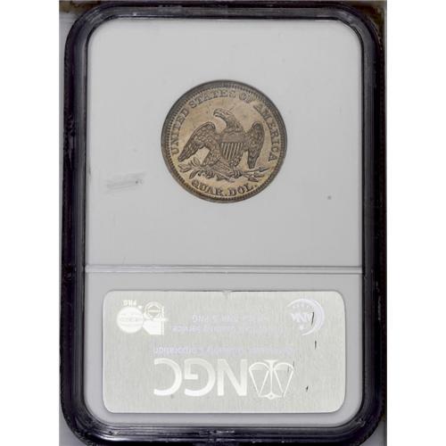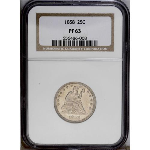 <B>1858<25C> PR63 NGC.</B></I> The watery surfaces are deeply toned on both sides by smoky plum and bronze-green patina. Better preserved than many of this scarce early proof issue, a few field marks and hairlines, and a large abrasion just above Liberty's head, limit the grade. One of just 300 pieces reportedly struck, of which few have survived in any condition. Census: 6 in 63, 33 finer (3/06).