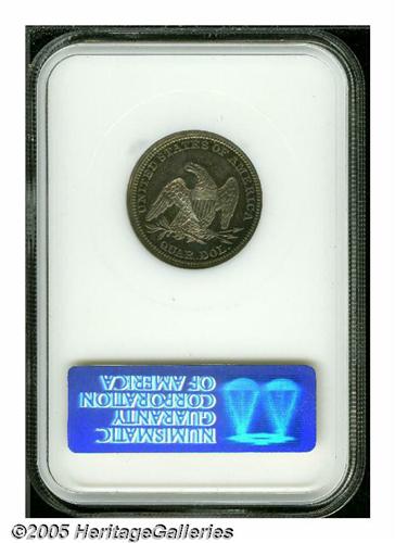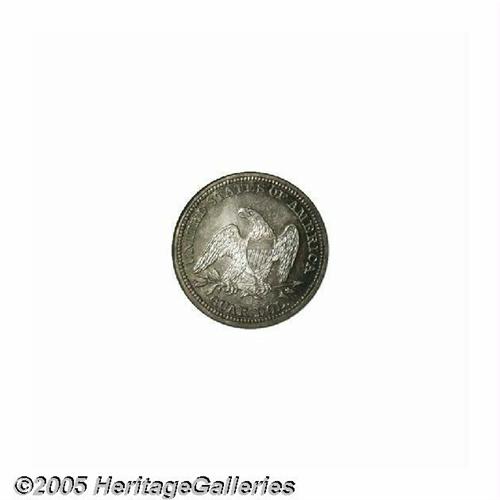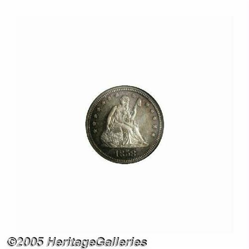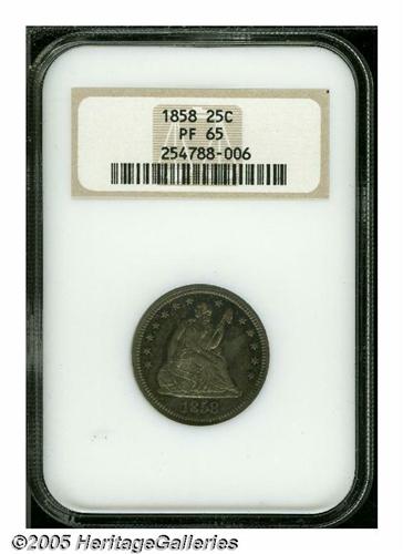 <B>1858<25C> PR65 NGC.</B></I> Aquamarine, salmon-pink, and plum colors endow the unblemished and prominently mirrored fields. Boldly struck aside from the final star and a couple of nearby denticles. 1858 was the first year that proofs were offered for sale to collectors. The actual mintage is unrecorded, but the <I>Guide Book</B></I> suggests 300+ pieces. What is known is that the 1858 is scarcer as a proof than the remaining dates of the Seated Liberty series. Population: 8 in 65, 4 finer (6/05).