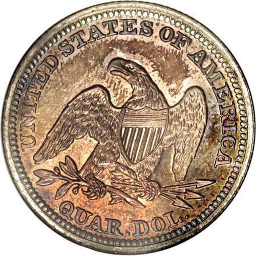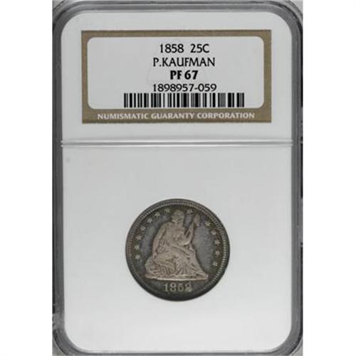 <B>1858 25C Quarter PR67 NGC.</B></I> Ex: P. Kaufman. The Kaufman Superb Gem proof ranks high in the lineup of proof 1858 quarters, probably the finest known. It is the best ever certified by NGC over 20 years of certification. Historically billed as the first year that proofs were widely available, many collectors today begin collections of proofs with this year. Mintages were higher and so is demand.<BR> It seems that this year is the first where Mint records were kept regarding proof mintages, although that may not be the case. For much of the 20th century, a mintage figure of 80 proofs was used for the 1858 silver coins. However, this mintage figure did not originate with mint records, but rather, it seems to have originated with one of the Chapman brothers. Much effort has been expanded to arrive at an approximate mintage, especially for the proof-only silver dollar. It became obvious that the 80 coin figure was not correct when certified populations substantially exceeded that amount. Considerable time and energy has been spent by many to determine more accurate estimates of mintage.<BR> The base of the 1 is lightly doubled, and the final 8 appears to lean slightly to the right. Faint die lines connect the D and S and others connect the S and O. Both dies are otherwise well made with few diagnostic features. Briggs assigned proofs the variety number 5-E in his reference, although few of his diagnostics match this coin. The reverse is a new die not previously used, replacing the bulged die of 1856 and 1857.<BR> The obverse has a few minor lint marks, similar to most proof quarters of the date. The fields are deep mirrors beneath pale champagne toning with intense peripheral gold, lilac, and blue near the borders, especially on the obverse. A sharp strike is indicated by full design features and a high wire rim on both sides. Census: 1 in 67, 0 finer (6/07).<BR><I>Ex: Louis E. Eliasberg, Sr. (Bowers and Merena, 4/1997), lot 1468.<BR>From The Phil Kaufman Collection of Early Proof Sets, Part One.</B></I> (#5554)<BR><BR><BR><B>Coin Engraver:</B> Christian Gobrecht<BR><BR><b>Shipping:</b> Coins & Currency (<a target="_blank" href="http://www.heritageauctions.com/common/shipping.php">view shipping information</a>\)