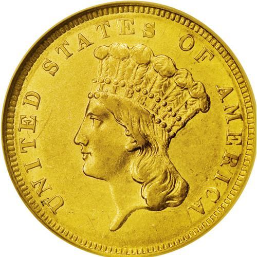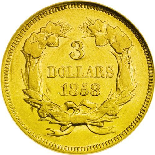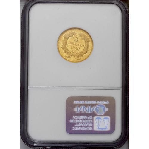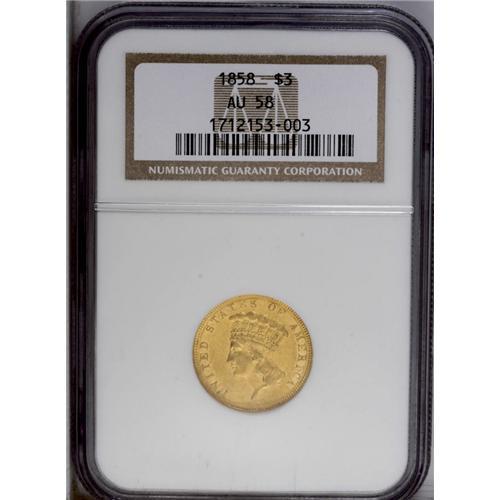 <B>1858<$3> AU58 NGC.</B></I> This is an amazingly rare date, and one that is not often discussed during discussions of gold rarities. The mintage was just 2,133 coins, and only about 5% of those survive today. In <I>The United States $3 Gold Pieces,</B></I> Dave Bowers and Doug Winter suggested that only about 125 examples survive. They continued: "At one time this date was the darling of writers for auction catalogues, but in recent decades its fame has dimmed, most probably because current market emphasis is on high-grade Mint State coins, even of common dates, and truly rare coins at levels such as EF and AU are relatively unnoticed." This example is a lovely specimen with rich yellow-gold luster and frosty surfaces. A few faint hairlines and abrasions are relatively harmless. NGC has only certified 10 finer examples of this date (7/06).<BR><I>From The Derrick Snider Collection.</B></I>