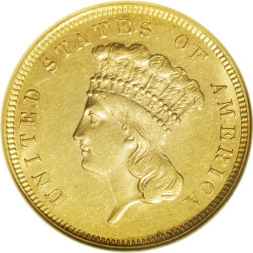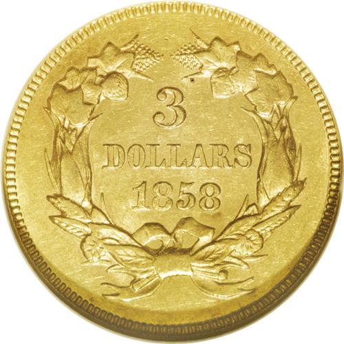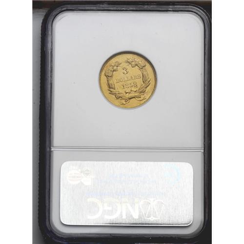 <B>1858<$3> MS61 NGC.</B></I> The 1858 is the first "issue rarity" in the series of three dollar gold pieces from the Philadelphia Mint, with production reduced to 2,133 business strikes. It is also a significant condition rarity. The majority of survivors are VF to XF quality, with slightly fewer AU coins known. Akers ranked the 1858 as 8th in the series according to rarity by average grade. This is a shimmering, boldly struck coin that is tinted a pleasant yellow-gold, and shows some trivial scuffiness in the fields with no appreciable abrasions. A mere handful of 1858 threes exist today in Mint State. Census: 1 in 61, 6 finer (6/06).