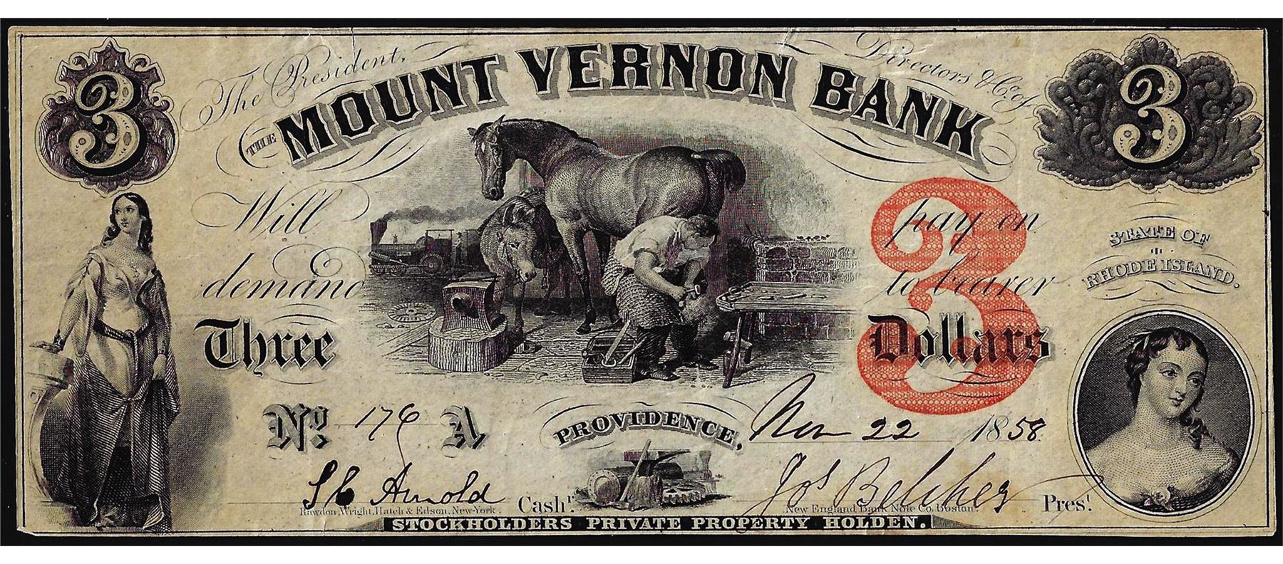 One 1858 $3 Mount Vernon Bank Providence, Rhode Island Obsolete Note.