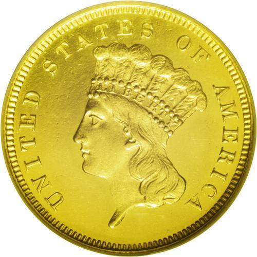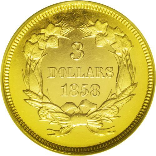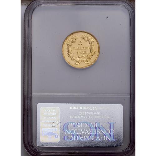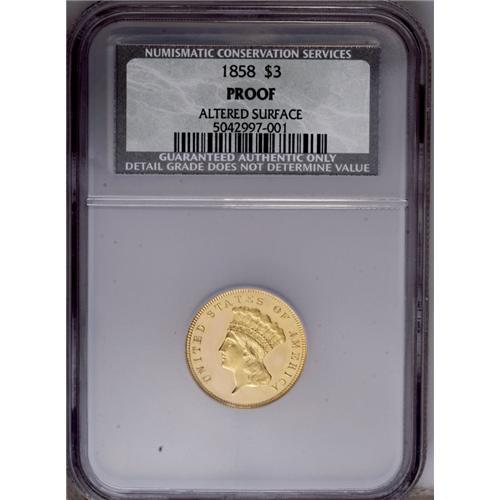 <B>1858<$3> PR60--Altered Surface--NCS.</B></I> 1858 was the first year that the U.S. Mint began publicly advertising proof sets for public sale under Mint Director James Ross Snowden. Bowers and Winter (2005) estimate 7 to 8 proofs are known, likely fewer than the quantity of specialists actively assembling proof collections of this favored gold denomination. To the unaided eye, this specimen appears spectacular, with frosty devices and glassy mirrored fields. A strong lens reveals delicate tooling of the reverse field near the prominent 3, and near the rim between 11 and 5 o'clock. The obverse field is curiously glossy.