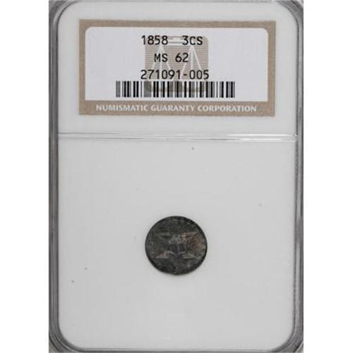 <B>1858 3CS MS62 NGC.</B></I> NGC Census: (48/325). PCGS Population (47/284). Mintage: 1,604,000. Numismedia Wsl. Price for NGC/PCGS coin in MS62: $425. (#3674)<BR><BR><B>Coin Engraver:</B> James B. Longacre<BR><BR><b>Shipping:</b> Coins & Currency (<a target="_blank" href="http://www.heritageauctions.com/common/shipping.php">view shipping information</a>)
