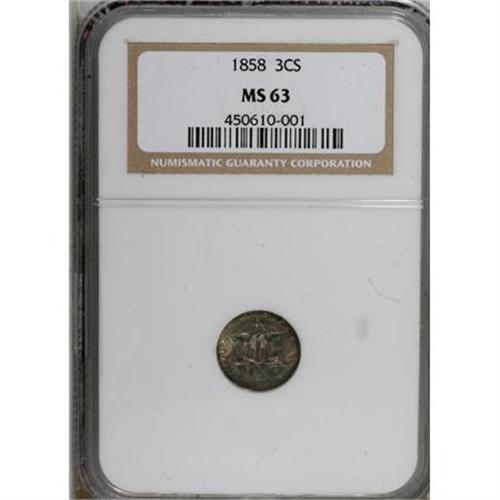 <B>1858 3CS MS63 NGC.</B></I> NGC Census: (89/237). PCGS Population (97/189). Mintage: 1,604,000. Numismedia Wsl. Price for NGC/PCGS coin in MS63: $575. (#3674)<BR><BR><B>Coin Engraver:</B> James B. Longacre<BR><BR><b>Shipping:</b> Coins & Currency (<a target="_blank" href="http://www.heritageauctions.com/common/shipping.php">view shipping information</a>)