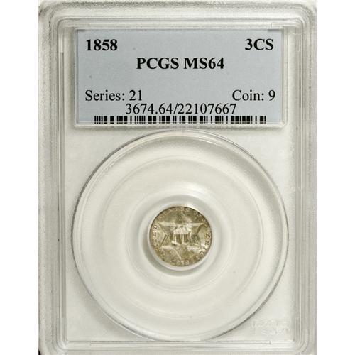 <B>1858 3CS MS64 PCGS.</B></I> Well struck and lustrous with silver-gray and rose patina over each side. A handful of minor abrasions on and near the obverse devices account for the grade.<BR><I>From The Frank J. McCarthy Jr. Collection.</B></I><BR><BR><b>Shipping:</b> Coins & Currency (<a target="_blank" href="http://www.heritageauctions.com/common/shipping.php">view shipping information</a>)