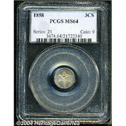 <B>1858<3CS> MS64 PCGS.</B></I> Boldly struck, except for weakness in the outer lines of the star in the lower left obverse quadrant, and on some of the reverse star centers. Lustrous silver-gray surfaces reveal just a touch of olive toning, and appear to be devoid of significant marks. Clash marks are seen on each side. <BR><BR><B>Important notice:</B> Heritage usually auctions material at the rate of 200-250 lots per hour. On some occasions eBay Live bid software or the Internet may not be able to keep up with the pace of the auction. We recommend placing a realistic absentee bid now as insurance to avoid disappointment. Occasionally the auctioneer may eliminate or reject an eBay Live bid, and the auctioneer may also reopen a lot after the close of the eBay live bidding (usually because we missed an audience bid), and may reject your bid even if it shows you as the winning bidder. By bidding via eBay Live, you agree that Heritage may award the lot to another bidder at its sole discretion under the circumstances described above or any other reasonable circumstances. Since eBay bids are not shown to us until we open the lot on the floor, we treat those bids just like floor bids. In most cases the floor responds before the eBay bid is presented to us, due to Internet lag time, so for consistency we have made it a policy that floor bids are always considered first over tie eBay live bids. Also please note that all Heritage lots purchased through eBay Live carry a 20% Buyer's Premium. Please make sure you read the Terms and Conditions before you bid.
