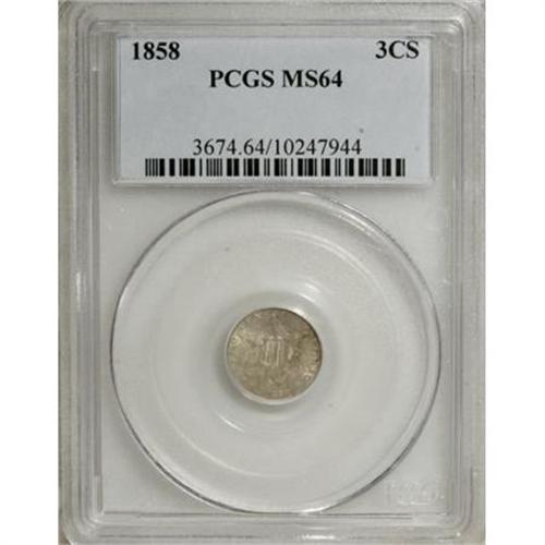 <B>1858 3CS MS64 PCGS.</B></I> A cream-gray and walnut-brown near-Gem with vibrant luster and gorgeously smooth fields. Excellent technical preservation, though the central devices show a degree of typical softness.<BR><BR><B>Coin Engraver:</B> James B. Longacre<BR><BR><b>Shipping:</b> Coins & Currency (<a target="_blank" href="http://www.heritageauctions.com/common/shipping.php">view shipping information</a>)