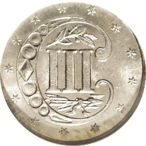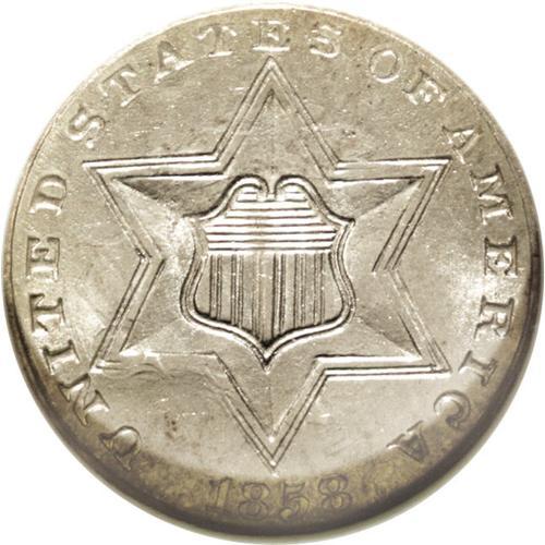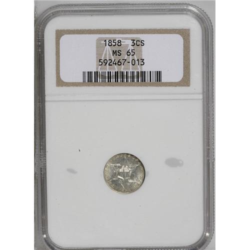 <B>1858<3CS> MS65 NGC.</B></I> A lightly toned and lustrous golden-gray Gem with pleasing preservation and an above average strike. Scarce in finer grades, and desirable as the final issue of the elusive Variety Two type. The obverse design would be modified in 1859 by removing the innermost outline of the star. Distinct clash marks are observed on each side, and some minor planchet buckling is noted on the obverse. Census: 42 in 65, 30 finer (7/06).