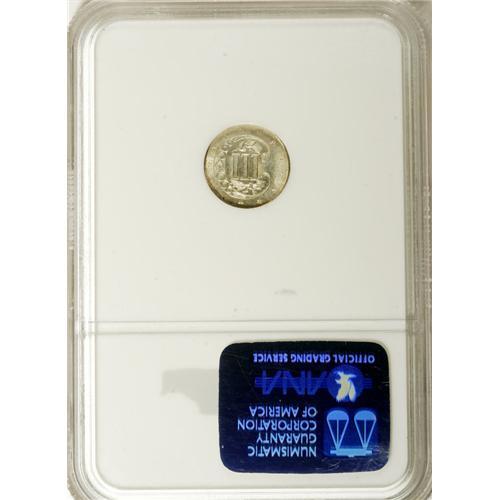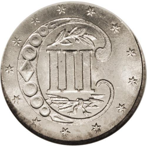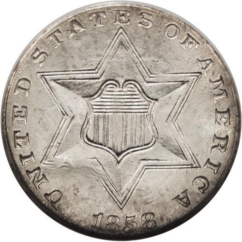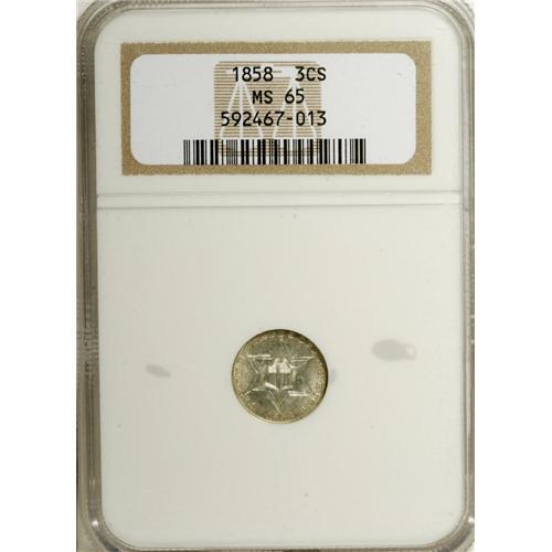 <B>1858 3CS MS65 NGC.</B></I> A lightly toned and lustrous golden-gray Gem with pleasing preservation and an above average strike. Scarce in finer grades, and desirable as the final issue of the elusive Variety Two type. The obverse design would be modified in 1859 by removing the innermost outline of the star. Distinct clash marks are observed on each side, and some minor planchet buckling is noted on the obverse. Census: 44 in 65, 33 finer (12/06).<BR><BR><b>Shipping:</b> Coin/Currency (<a target="_blank" href="http://www.heritageauctions.com/common/shipping.php">view shipping information</a>)