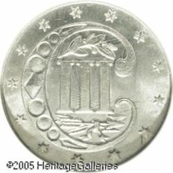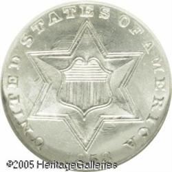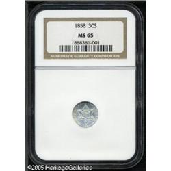 <B>1858 3CS MS65 NGC.</B></I> Always popular with collectors as the 1858 is the most available Type Two issue. That, however, isn't saying much even with 1.6 million pieces struck. It is still a very difficult date to obtain in Uncirculated grades and especially elusive in Gem condition. Only 38 pieces have been so graded by NGC with 29 finer (1/05). This is a brilliant piece with shimmering mint luster and the usual die clashing in the fields. Very sharply defined, especially on the obverse. Lot:5652