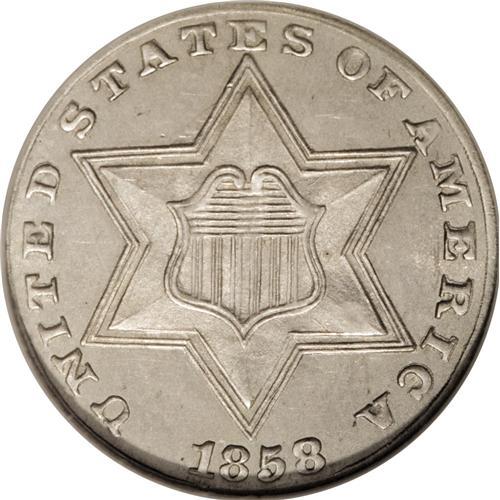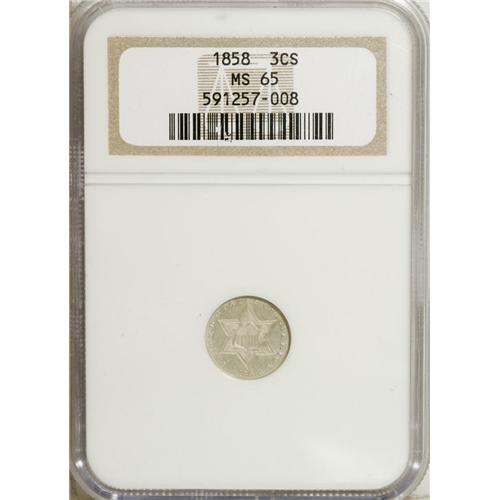 <B>1858 3CS MS65 NGC.</B></I> This is the final year of the Type Two design, recognized by the double outline around the large obverse star. Type One coins have no outline and Type Three coins have a single outline. We are not aware of any past nomenclature that has been presented to give these pieces more descriptive names. Since the outlines add to the size of the star, perhaps the three types could be called Small Star, Large Star, and Medium Star respectively. This Gem is a pleasing piece with no toning on either side. The obverse has reflective satin luster and the reverse has frosty luster.<BR><BR><b>Shipping:</b> Coins & Currency (<a target="_blank" href="http://www.heritageauctions.com/common/shipping.php">view shipping information</a>)