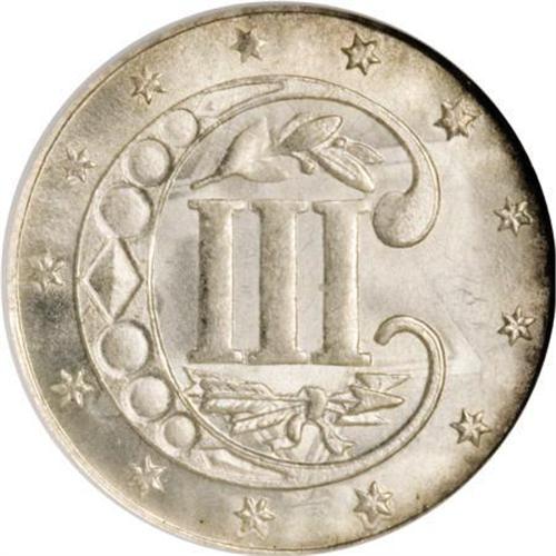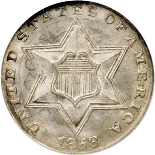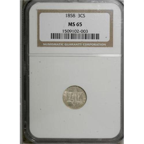 <B>1858 3CS MS65 NGC.</B></I> An unusually high grade example of this Philadelphia Mint issue, from the final year of the Type Two design. This Gem is boldly struck, with heavy clash marks noted on the obverse, and lighter clash marks on the reverse. The nearly blemish-free surfaces are untoned and project a pleasing satiny sheen. Census: 43 in 65, 31 finer (9/07). <BR><BR><B>Coin Engraver:</B> James B. Longacre<BR><BR><b>Shipping:</b> Coins & Currency (<a target="_blank" href="http://www.heritageauctions.com/common/shipping.php">view shipping information</a>)