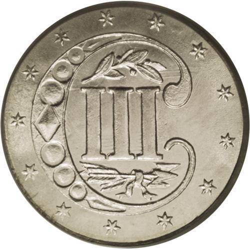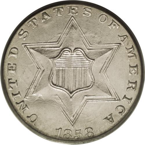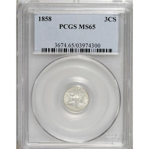<B>1858 3CS MS65 PCGS.</B></I> Bright lustrous surfaces exhibit barely discernible wisps of light tan peripheral color, and are devoid of significant contact marks. The design elements are crisply impressed, including the reverse leaves that show most of the ribbing. Relatively strong clash marks occur on both sides. Population: 41 in 65, 41 finer (2/07).<BR><BR><b>Shipping:</b> Coins & Currency (<a target="_blank" href="http://www.heritageauctions.com/common/shipping.php">view shipping information</a>)