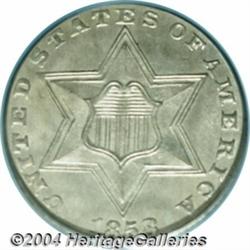<table><tr><td><table><tr><td>1858 3CS MS65 PCGS. Final year of the elusive Type Two design, and always in demand as a type coin in Gem condition. This is an untoned example that has satiny mint luster characteristics. Better struck than most, this piece has the heavy die clashing that is normally seen on this type.From the Robert Bowling Collection. <BR><BR><B>Important notice:</B> Heritage usually auctions material at the rate of 200-250 lots per hour. On some occasions eBay Live bid software or the Internet may not be able to keep up with the pace of the auction. We recommend placing a realistic absentee bid now as insurance to avoid disappointment. Occasionally the auctioneer may eliminate or reject an eBay Live bid, and the auctioneer may also reopen a lot after the close of the eBay live bidding (usually because we missed an audience bid), and may reject your bid even if it shows you as the winning bidder. By bidding via eBay Live, you agree that Heritage may award the lot to another bidder at its sole discretion under the circumstances described above or any other reasonable circumstances. Since eBay bids are not shown to us until we open the lot on the floor, we treat those bids just like floor bids. In most cases the floor responds before the eBay bid is presented to us, due to Internet lag time, so for consistency we have made it a policy that floor bids are always considered first over tie eBay live bids. Also please note that all Heritage lots purchased through eBay Live carry a 20% Buyer's Premium. Please make sure you read the Terms and Conditions before you bid. <BR><BR><B>IMPORTANT ANNOUNCEMENT ABOUT RESERVES:</B> Heritage now divulges all reserves on its web site 7 days before every auction. If you want to know whether the reserve on this lot has been met, and if not, what the reserve amount is, please visit this lot page on the HeritageCoin.com web site, or email: bid@HeritageGalleries.com </span></font></td></tr></table></td></tr></table>