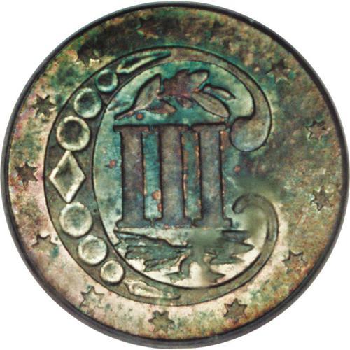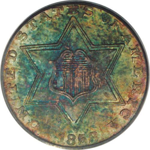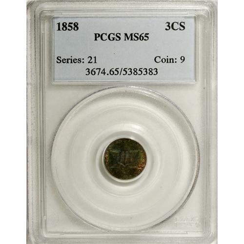 <B>1858 3CS MS65 PCGS.</B></I> This Gem exhibits a virtual kaleidoscope of color on both sides, with blue and sea-green over much of the surface, accented by rose and pale gold. Most of the design elements are well detailed, although some peripheral and central weakness is detected. This is a frosty and lustrous Gem that retains considerable eye appeal.<BR><BR><b>Shipping:</b> Coin/Currency (<a target="_blank" href="http://www.heritageauctions.com/common/shipping.php">view shipping information</a>)