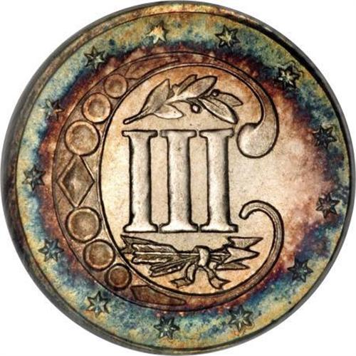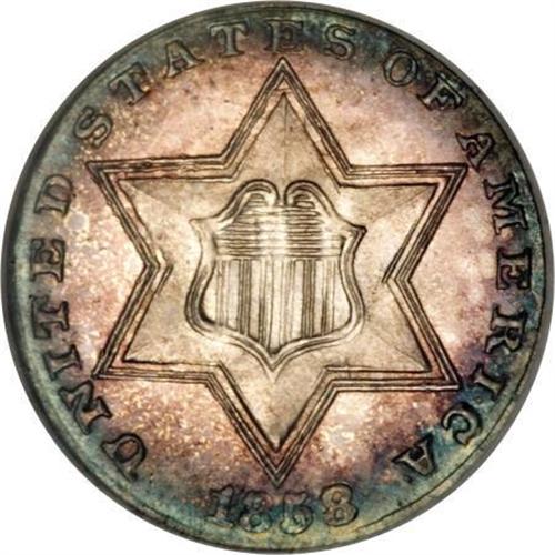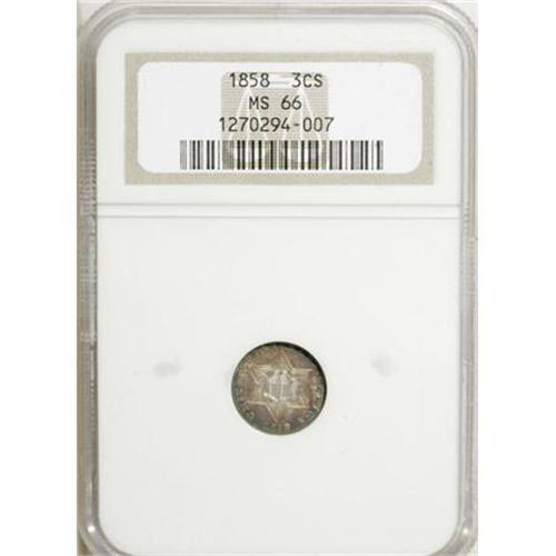 <B>1858 3CS MS66 NGC.</B></I> Last year of the Type Two design and the most frequently encountered date within that elusive type. This is a remarkably well struck coin that only shows softness on the leaves on the reverse, as usual. The surfaces are bright and frosted. The untoned centers are surrounded by rich golden-rose and cobalt-blue toning at the margins. A splendid type coin. Census: 17 in 66, 14 finer (11/07).<BR><I>From The Madison Collection.</B></I><BR><BR><B>Coin Engraver:</B> James B. Longacre<BR><BR><b>Shipping:</b> Coins & Currency (<a target="_blank" href="http://www.heritageauctions.com/common/shipping.php">view shipping information</a>)