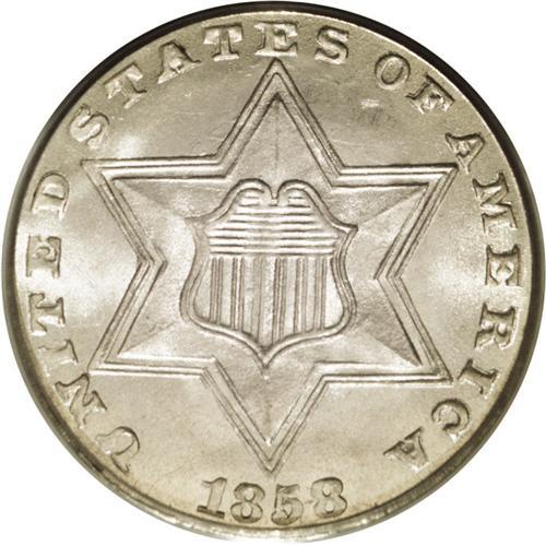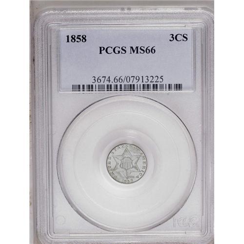 <B>1858<3CS> MS66 PCGS.</B></I> Final year of the Type Two design. Sharply struck except for some of the reverse stars, with die clash marks noted on each side. Bright and untoned with a flashy sheen and the absence of any noticeable blemishes. A fabulous Premium Gem. Population: 33 in 66, 10 finer (5/06).
