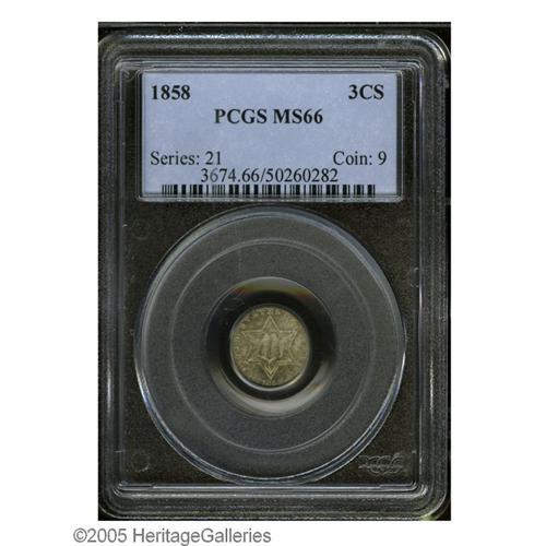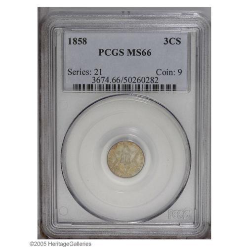 <B>1858<3CS> MS66 PCGS.</B></I> The most available year of the Type Two design, and yet still a very scarce (and desirable) type coin. This piece has exceptionally lustrous surfaces with an overlay of sea-green and golden-rose on the obverse, with a reverse that shows ice-blue patina with underlying iridescence. A bit softly struck in the usual places on the reverse. Population: 27 in 66, 10 finer (10/05).