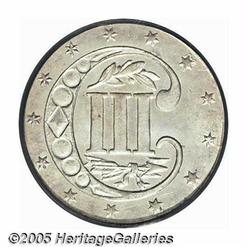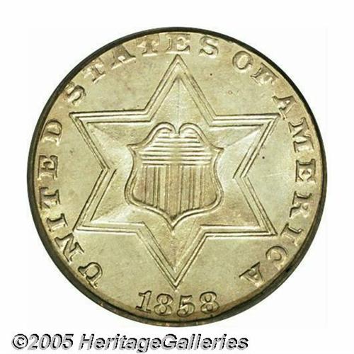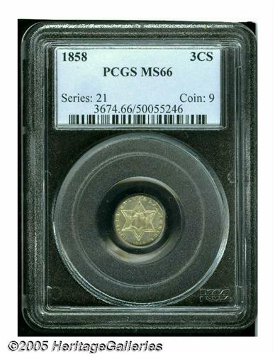 <B>1858<3CS> MS66 PCGS.</B></I> Type Two three cent silver pieces were a short-lived series that was produced from 1854 through 1858. They are also the most difficult to locate in high grades. This holds true also for the 1858 even though some 1.6 million pieces were produced that year. This piece retains much of the original mint brilliance with a light overlay of golden-rust patina. Sharply struck with almost complete definition on the leaves on the reverse. Population: 27 in 66, 10 finer (6/05).<BR><I>From The Melrose Bay Collection.</B></I>