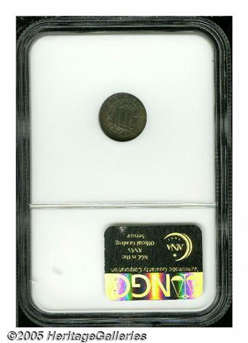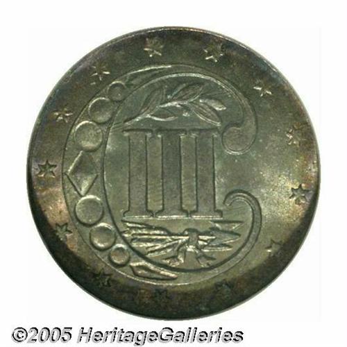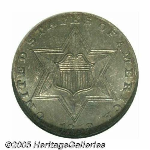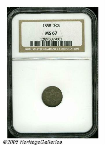 <B>1858<3CS> MS67 NGC.</B></I> This is the final year of the Type Two design subtype, and is one of the more commonly available issues in all grades up through the Gem level. At the Superb Gem grade, however, this becomes a tremendous rarity as NGC has graded only 14 such examples to date (4/05), with none finer. None of those other examples is likely to surpass this example is terms of either eye appeal or technical merit, as the shimmering surfaces display rich, swirling tones of gunmetal-blue, crimson, and golden-olive patina. It is virtually absent of marks or abrasions on either side, although evidence of light die clashing is evident. A gorgeous "trime" that is ideal for a Superb Gem type set or for a specialized high grade collection.