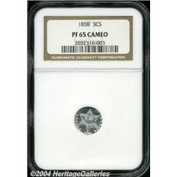 <B>1858<3CS> PR65 Cameo NGC.</B></I> Breen estimates that 60-75 proof Trimes were produced this year, only about two or three dozen of which are extant. An early die state, this coin exhibits numerous striations (as produced) slanting down to the right in the obverse field. The finish is fully brilliant, and the surfaces shimmer with a very slight cameo effect noted on each side. A remarkable Gem proof Type Two Three Cent Silver piece. <BR><BR><B>Important notice:</B> Heritage usually auctions material at the rate of 200-250 lots per hour. On some occasions eBay Live bid software or the Internet may not be able to keep up with the pace of the auction. We recommend placing a realistic absentee bid now as insurance to avoid disappointment. Occasionally the auctioneer may eliminate or reject an eBay Live bid, and the auctioneer may also reopen a lot after the close of the eBay live bidding (usually because we missed an audience bid), and may reject your bid even if it shows you as the winning bidder. By bidding via eBay Live, you agree that Heritage may award the lot to another bidder at its sole discretion under the circumstances described above or any other reasonable circumstances. Since eBay bids are not shown to us until we open the lot on the floor, we treat those bids just like floor bids. In most cases the floor responds before the eBay bid is presented to us, due to Internet lag time, so for consistency we have made it a policy that floor bids are always considered first over tie eBay live bids. Also please note that all Heritage lots purchased through eBay Live carry a 20% Buyer's Premium. Please make sure you read the Terms and Conditions before you bid.