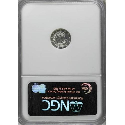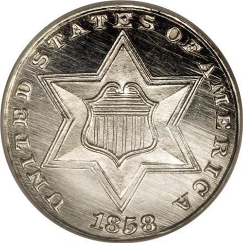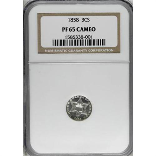 <B>1858 3CS PR65 Cameo NGC.</B></I> NGC has only certified seven Cameo proof examples of this issue. None have been certified with the Deep Cameo designation, by either of the two major grading services. All of the design elements are sharply rendered, and the fields are glassy and highly reflective. Numerous die polish lines are noted on the obverse, where parts of the lower left shield border have been polished away. Census: 3 in 65 Cameo, 2 finer (6/07). <BR><BR><b>Shipping:</b> Coins & Currency (<a target="_blank" href="http://www.heritageauctions.com/common/shipping.php">view shipping information</a>\)