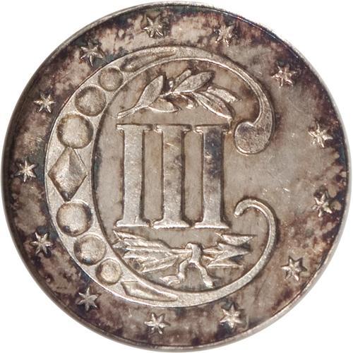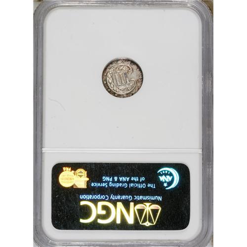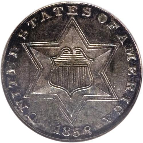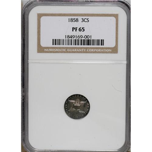 <B>1858 3CS PR65 NGC.</B></I> Reported mintages of the 1858 proof three cent silver coins range from between 60 to 75 pieces (Walter Breen, 1977) to 300 plus examples (2007 <I>Guide Book</B></I>). The number is probably somewhere in between, judging from the 175 or so examples certified by NGC and PCGS. Whispers of cobalt-blue and lilac toning adorn bright, well preserved surfaces on the PR65 specimen offered in this lot. The design elements exhibit the result of an exquisite strike, as no areas reveal hints of weakness. Excessive die polishing has removed a couple of small segments of the star outlines in the lower left obverse quadrant, and associated die striations are noted in the obverse fields. A truly stunning Gem proof! Census: 22 in 65, 22 finer (4/07).<BR><BR><b>Shipping:</b> Coins & Currency (<a target="_blank" href="http://www.heritageauctions.com/common/shipping.php">view shipping information</a>)