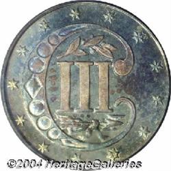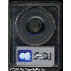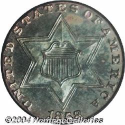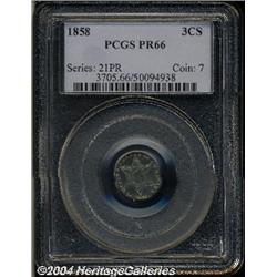 <B>1858<3CS> PR66 PCGS.</B></I> Since the year 1858 was the first in which the Mint issued proof coinage for general commercial distribution and since it was the final year of the Type Two design of this denomination, this issue is highly sought after for type set purposes. This piece displays shimmering reflectivity and ample splashes of aqua and golden-blue toning on both sides. The obverse shows the die striations which are diagnostic for the issue, the strength of which argue that this was one of the first examples produced. Population: 8 in 66, 0 finer (9/04). <BR><BR><B>Important notice:</B> Heritage usually auctions material at the rate of 200-250 lots per hour. On some occasions eBay Live bid software or the Internet may not be able to keep up with the pace of the auction. We recommend placing a realistic absentee bid now as insurance to avoid disappointment. Occasionally the auctioneer may eliminate or reject an eBay Live bid, and the auctioneer may also reopen a lot after the close of the eBay live bidding (usually because we missed an audience bid), and may reject your bid even if it shows you as the winning bidder. By bidding via eBay Live, you agree that Heritage may award the lot to another bidder at its sole discretion under the circumstances described above or any other reasonable circumstances. Since eBay bids are not shown to us until we open the lot on the floor, we treat those bids just like floor bids. In most cases the floor responds before the eBay bid is presented to us, due to Internet lag time, so for consistency we have made it a policy that floor bids are always considered first over tie eBay live bids. Also please note that all Heritage lots purchased through eBay Live carry a 20% Buyer's Premium. Please make sure you read the Terms and Conditions before you bid.