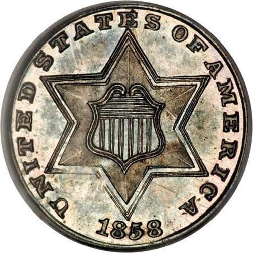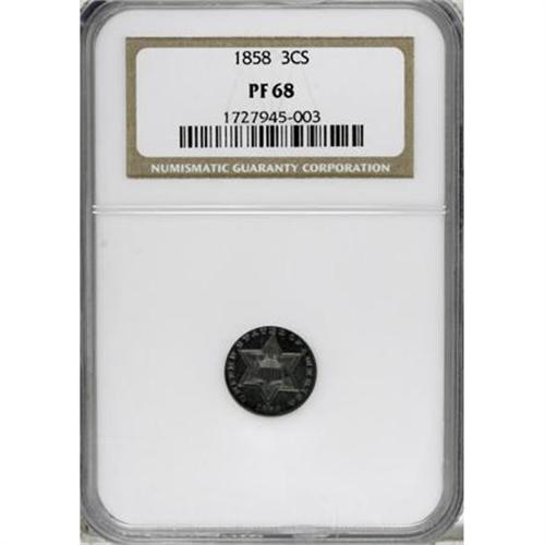 <B>1858 3CS PR68 NGC.</B></I> Sometimes, the greatest gifts come in the smallest packages. Such is the case with this magnificent three cent silver. Although the reported mintages range from between 60 to 75 pieces (Walter Breen, 1977) to 300 plus examples (2008 <I>Guide Book</B></I>), the proper number is probably somewhere in between, judging from the PCGS and NGC population data. The same population reports that researchers use to discern the mintage also confirm the rarity of this issue in extraordinary states of preservation. PCGS has graded no examples finer than PR67 and NGC has certified a sole example in PR68 (12/07), the presently offered lot. Steel-gray toning covers the obverse. The reverse has more cobalt-blue color and a slightly golden center that adds heat to the otherwise cool surfaces. The mirrors are as deep as one will find on a trime and the devices have an appreciable amount of frost on them. The design elements show an exquisite strike, and no areas reveal hints of weakness. Excessive die polishing has removed a couple of small segments of the star outlines in the southwest obverse quadrant and heavy diagonal die striations are noted in the obverse fields. The Type Two three cent silver is undoubtedly one of the most eagerly sought type coins in U.S. numismatics. Its short life span of only five years for the type and 1858 being the only year generally found in proof, make the proof Type Two a perennial favorite of both collectors and investors alike.<BR><BR><B>Coin Engraver:</B> James B. Longacre<BR><BR><b>Shipping:</b> Coins & Currency (<a target="_blank" href="http://www.heritageauctions.com/common/shipping.php">view shipping information</a>)