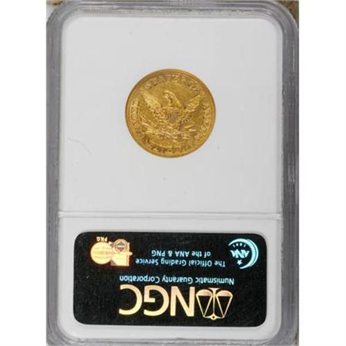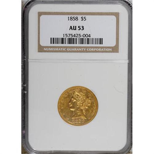 <B>1858 $5 AU53 NGC.</B></I> This is a low-mintage date, with a production of just 15,136 coins. Most survivors are well circulated and rather unattractive. This example is a pleasing exception with lustrous greenish-gold surfaces.<BR><BR><b>Shipping:</b> Coins & Currency (<a target="_blank" href="http://www.heritageauctions.com/common/shipping.php">view shipping information</a>)