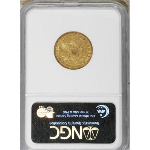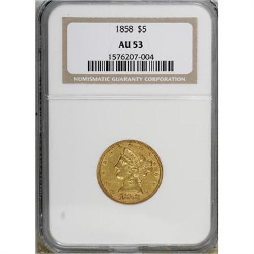 <B>1858 $5 AU53 NGC.</B></I> NGC Census: (8/41). PCGS Population (3/20). Mintage: 15,136. Numismedia Wsl. Price for NGC/PCGS coin in AU53: $1,100. (#8276)<BR><BR><B>Coin Engraver:</B> Christian Gobrecht<BR><BR><b>Shipping:</b> Coins & Currency (<a target="_blank" href="http://www.heritageauctions.com/common/shipping.php">view shipping information</a>)