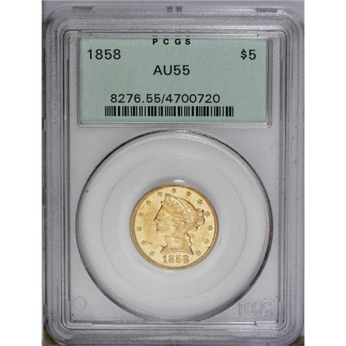 <B>1858<$5> AU55 PCGS.</B></I> Glowing luster is extensive for the grade, and the strike is above average. The obverse has a few inconspicuous specks of struck-in grease. Housed in a green label holder. Just 15,136 pieces were struck. Population: 5 in 55, 14 finer (3/06).<BR><I>From The Steve Glenn Collection.</B></I> <BR><BR><B>Important notice:</B> Heritage usually auctions material at the rate of 200-250 lots per hour. On some occasions eBay Live bid software or the Internet may not be able to keep up with the pace of the auction. We recommend placing a realistic absentee bid now as insurance to avoid disappointment. Occasionally the auctioneer may eliminate or reject an eBay Live bid, and the auctioneer may also reopen a lot after the close of the eBay live bidding (usually because we missed an audience bid), and may reject your bid even if it shows you as the winning bidder. By bidding via eBay Live, you agree that Heritage may award the lot to another bidder at its sole discretion under the circumstances described above or any other reasonable circumstances. Since eBay bids are not shown to us until we open the lot on the floor, we treat those bids just like floor bids. In most cases the floor responds before the eBay bid is presented to us, due to Internet lag time, so for consistency we have made it a policy that floor bids are always considered first over tie eBay live bids. Also please note that all Heritage lots purchased through eBay Live carry a 20% Buyer's Premium. Please make sure you read the Terms and Conditions before you bid. This lot is being auctioned in conjunction with a live floor auction by Heritage Galleries & Auctioneers. All final auction and invoice information will be supplied by Heritage Galleries & Auctioneers, and all other information should be considered preliminary. Lot:2739 <BR><BR><B>Winning Notification and Billing:</B> After the FINAL session in this auction is complete, Heritage will send e-mail and snail mail invoices. This process normally takes several days. All final auction and invoice information will be supplied by Heritage Galleries & Auctioneers, and all other information should be considered preliminary. <BR><BR>This auction will be conducted on a live auction floor and over the Internet through eBay Live. If you choose to place an absentee bid, please take a moment to <font color='#0000ff'><u><a href='http://pages.ebay.com/liveauctions/help/before/laabsentee.html'>learn how eBay Live absentee bidding works</a></u></font><font color='#000000'>